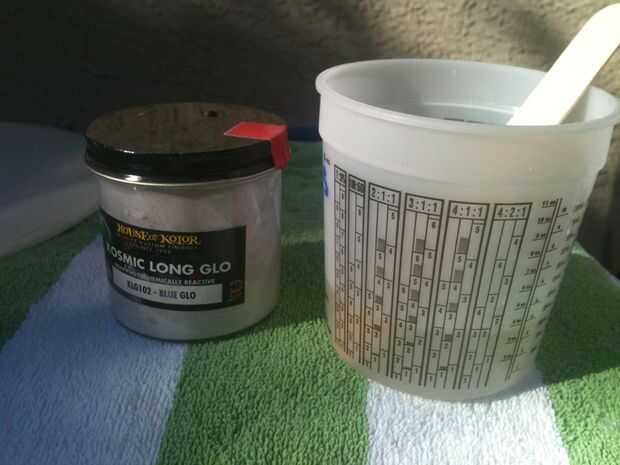 Usé "House of Color" Kosmic largo resplandor azul en este proyecto pero sugiero tratar Riesgo Reactor como se especializan en foto luminosa y pigmentos fluorescentes UV en muchos diversos colores a un precio mejor.