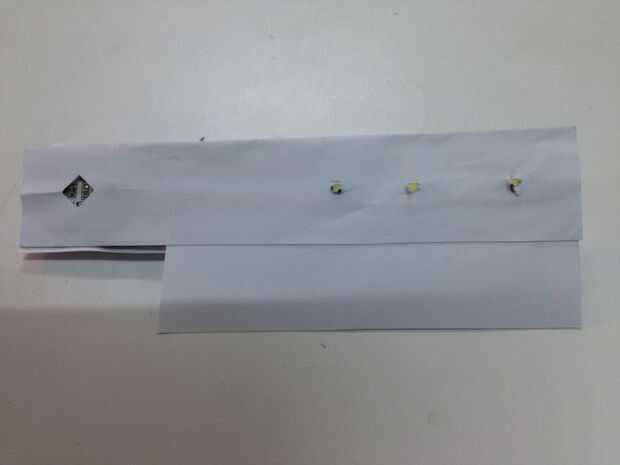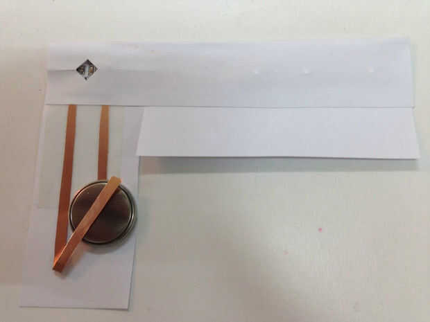 Cubrir el circuito con papel adicional que a la izquierda y un agujero para el sensor de luz y LED, hacerlo puede respuesta a la luz correctamente. doble la línea de cobre de modo que puede tocar el lado negativo de la batería.