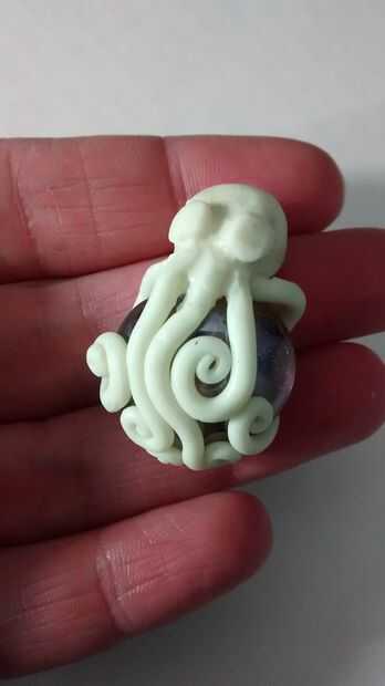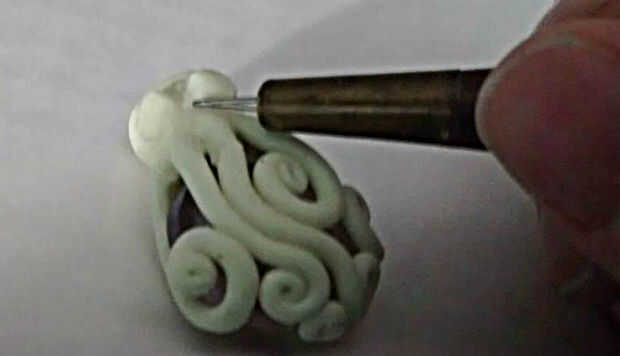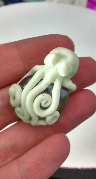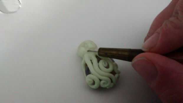 Lugar el a ambos lados del pulpo la cabeza y utilizar una herramienta de arcilla para mezclarlos suavemente en la cabeza.