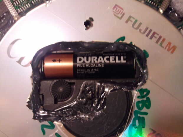 2) caliente pegamento mecanismo del reloj en CD. Ranura de la batería de posición sobre el recorte en el CD