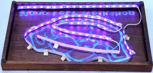 Después de que el epoxi es expuesto desde la parte posterior, agarra la tira del LED y decidir la mejor manera de distribuirlo en su diseño para obtener la exposición más. Acabé dando vueltas la cosa entera y luego zigzagueaba por el medio. Su alimentación de la tira de LED de la soldadura y entonces utilice algunos trozos pequeños de madera y caliente pegamento para establecer su LED en lugar.