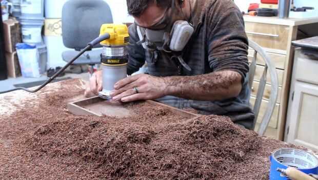Ahora que todas las piezas flotantes de su diseño están bloqueados en su lugar por el epoxi, puede tallar más de la parte posterior de la muestra exponiendo el epoxi de ambos lados. Puede utilizar la misma espiral cortado poco o algo más grande para acelerar el proceso si lo tienes disponible. Usted también querrá dejar un pequeño borde alrededor de la muestra para tratar de contener la mayoría de la luz ultravioleta. (Usted realmente desea ese respirador ahora.)