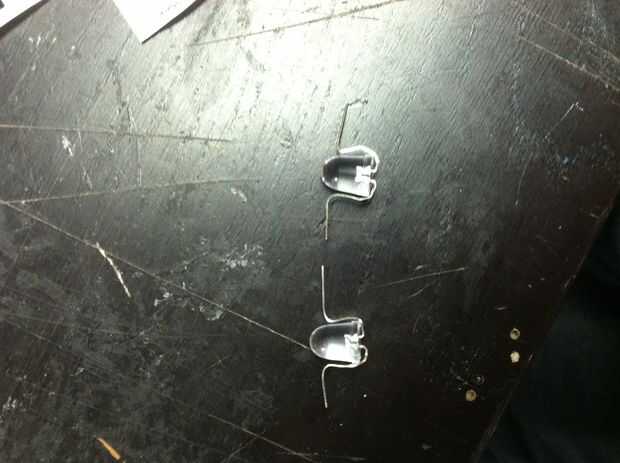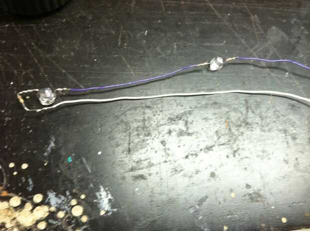 Luego doble los cables de led en la forma en la foto a continuación. Asegúrese de que usted entiende cuál es el lado positivo y que uno es negativo, puede decir esta varias maneras. Los conductores son de longitudes diferentes, el más largo es negativo. Si miras dentro de la parte real de la seta al lado con el componente más grande que tiene forma de un arma de fuego es el lado negativo...