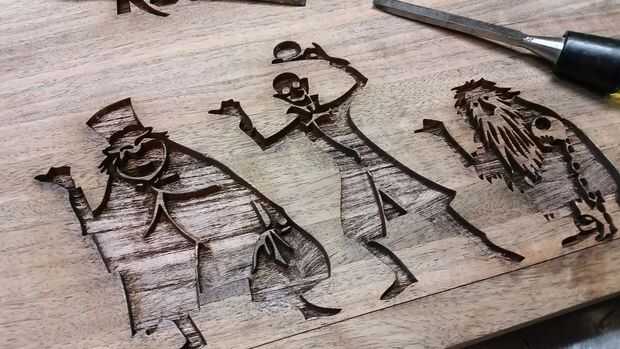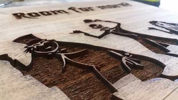 En este caso, utilicé a los fantasmas autostop de la mansión embrujada. Para ir con mi tema de juego de palabras de alimentos, se añadió la coletilla "Personal más?". Usé mi grabador del laser del CO2 100w para completar este paso. Necesita grabar bastante profundo para obtener la resina para obtener lo suficientemente gruesa como para tener una posición estable en la madera e iluminar cuando cargado para arriba con la luz. Esto me llevó alrededor de 5 pasos para llegar a una profundidad de aproximadamente 1/4". Si lo hice otra vez, yo definitivamente utilizar un router CNC para este paso y acelerar (a pesar de que no hará el mismo nivel de detalle). Utiliza un par de precisión de cinceles para limpiar y equilibrar la parte inferior, pero ahora que su completa, creo era necesario.