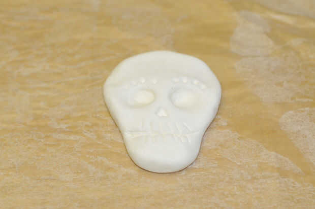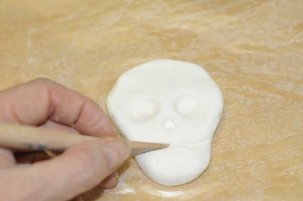 Tome el plano esculpir herramienta y dibuje una línea donde estarían los dientes y las líneas verticales entonces en parte superior e inferior de la línea para representar los dientes. He pulsado unos orificios alrededor de los zócalos del ojo para añadir interés. Con aguja hacer un orificio en la parte superior para colgar o para hacer un collar. Deje que este seco completamente. Debe ser difícil pero todavía un poco flexible cuando se seca.