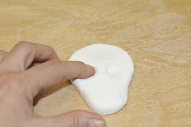 Tenga en cuenta que los zócalos del ojo deben ser y presione sus dedos en la arcilla para crear los sockets. Tomar la aguja y presione en un corazón al revés de la nariz. Presiona la arcilla en donde estarían los pómulos.