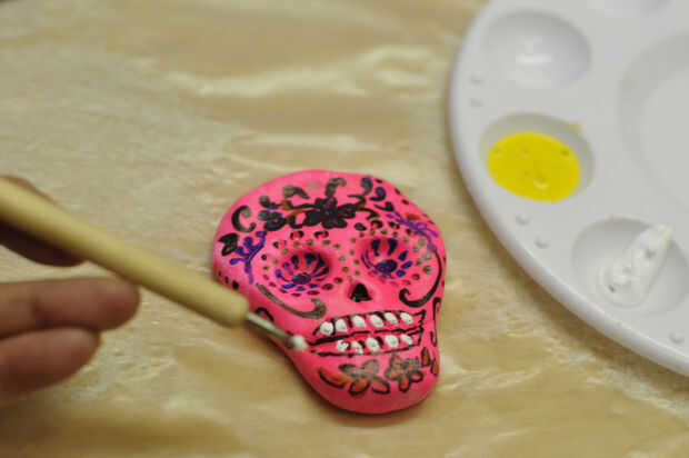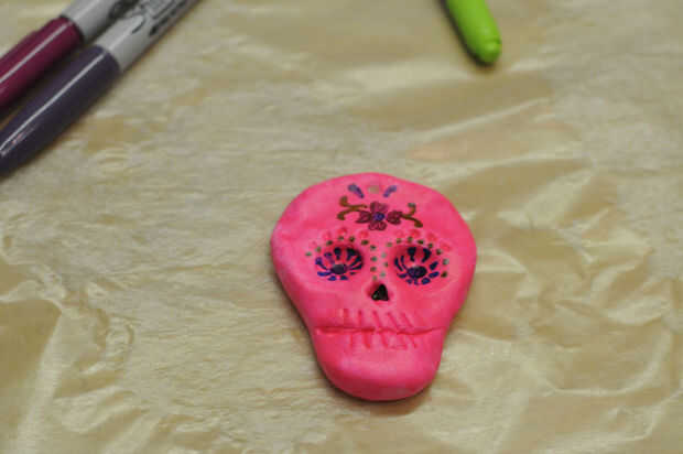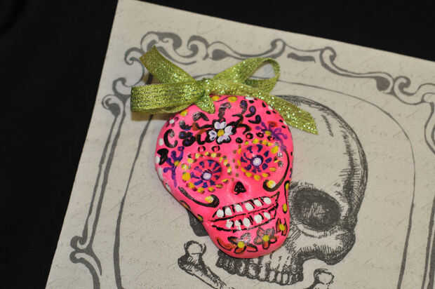 Con marcadores de hacer una línea de puntos en forma de flores o cualquier diseño que usted desea. Usa tu imaginación y diviértete! Utilice la punta de un lápiz opaco para agregar acentos con el Plaid FolkArt pintura acrílica amarilla y blanca. Que este seco. Sello de su proyecto por cepillado con Mod Podge. Déjelo secar. Pase una cinta, alambre o cadena a través del orificio en la parte superior de su cráneo de azúcar. Qué divertido manera de celebrar el día de los muertos!!!!