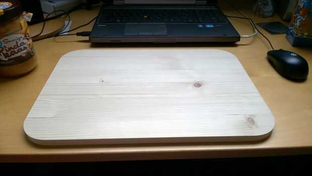 Todo esto empezado cuando hice una tabla de cortar de alguna madera que mentía alrededor de la casa. Hice este Tajo por pegar unos tableros de madera de pino y luego lijar todo con una lijadora de banda. Mi lijadora de banda también puede montarse en la mesa de trabajo, que es muy conveniente cuando quiere redondear las esquinas. Cuando fue terminado rápidamente comprendí que este pino no iba a sobrevivir una semana de corte.