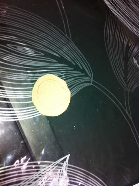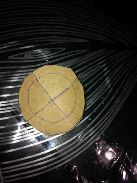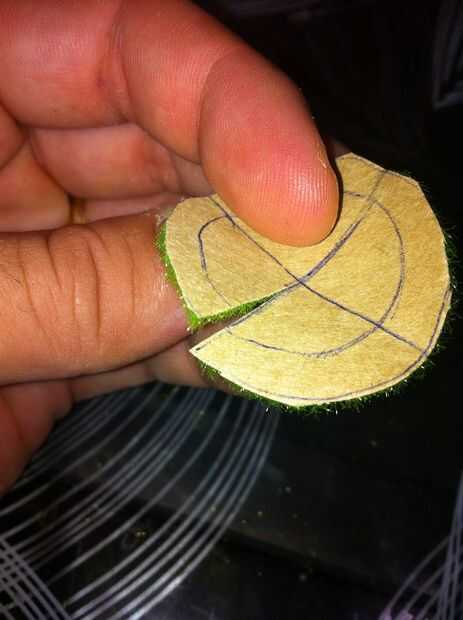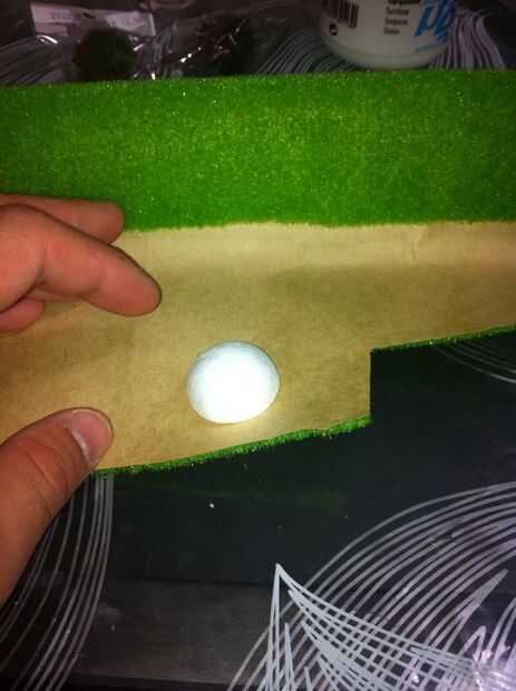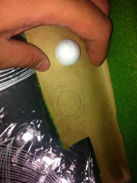 Cortar la bola de espuma de poliestireno por la mitad y le putt en la parte posterior de la placa de la hierba, que marque con un bolígrafo el radio de la bola... Ahora hacer otro círculo de unos 1,5 cm de ancho de la marca actual... Marque el centro del círculo en la placa de hierba y cortar a la mitad