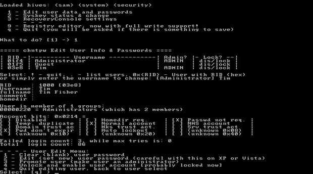 En la parte inferior de la pantalla youà ¢   veremos el menú de edición de usuario con varias opciones para elegir. Tipo 1 para Clear (blank) user password y presione Entrar. Offline NT Password & Registry Editor muestra alguna información interesante sobre el nombre de usuario que especificó en el paso pasado à   el nombre completo, qué grupos pertenece el usuario, cuántos intentos de login fallidos han tenido lugar, logins total cuántos se han completado y más. Si ves un cheque en el à ¢ Passwd   no req. Caja de   ¢ Ã, esto significa que una contraseña no es un requisito para este usuario en particular. Esto no significa que no se requiere una contraseña para acceder a la cuenta de Windows. En otras palabras, ità ¢   s diciendo que es posible borrar la contraseña de userà ¢   s.