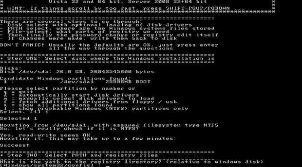 Offline NT Password & Registry Editor ahora necesita saber la ubicación exacta del registro de Windows. Excepto en raras ocasiones, la ubicación predeterminada será la correcta. Oprima ENTER para aceptar la ruta predeterminada de registro de Windows sin escribir nada.