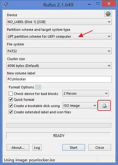Para crear un disco de arranque de PCUnlocker, descarga e instala el software gratuito Rufus. Después del lanzamiento de Rufus, seleccione la unidad USB conectada a su computadora, seleccione "Esquema de particiones GPT para equipo UEFI" y haga clic en el icono pequeño de la unidad de CD para localizar la imagen ISO PCUnlocker (pcunlocker.iso).