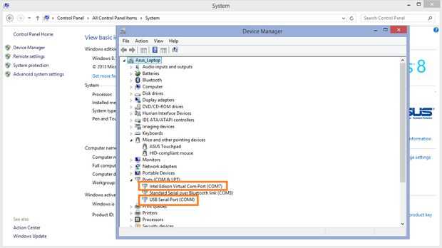 Para averiguar si el ordenador lo ve, usted necesitará entrar en su administrador de dispositivos. Vaya al panel de control y haga clic en sistema. A partir de ahí, a ver el administrador de dispositivos a la izquierda con el escudo de administrador al lado de él. Haga clic en eso y ahora puedes ver todo lo que está conectado al ordenador. Busque en puertos (COM & LPT). Usted debe encontrar "Intel Edison Virtual Com port ()" y "USB Serial Port ()". Para mí, es COM7 y COM4, respectivamente. Si usted no ve nada, debe solucionar los problemas.