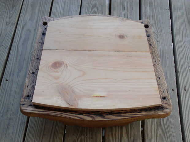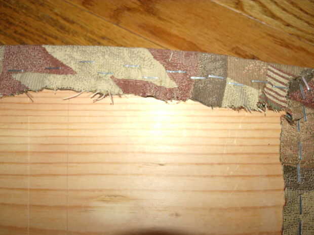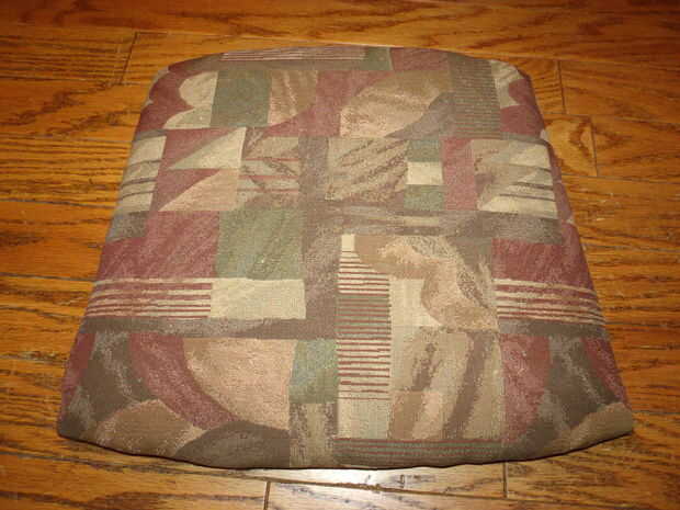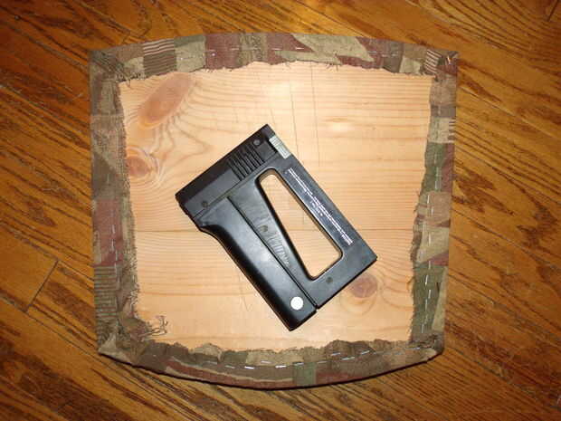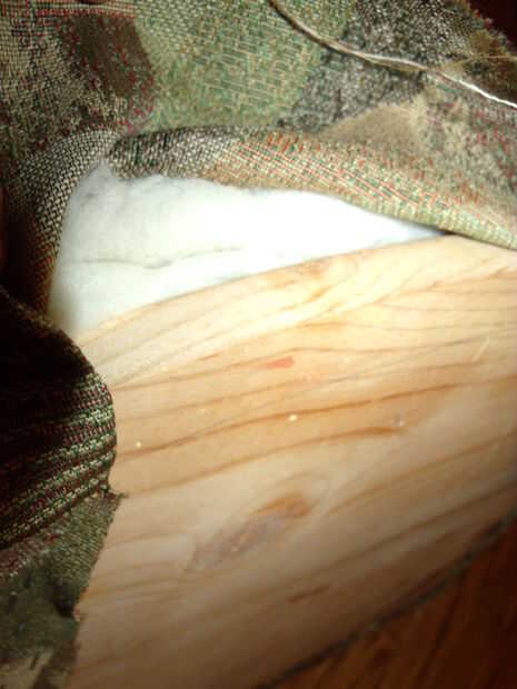 A continuación salí de algún material que heredé de mi mamá, cortar un trozo que cabría en el tablero con cerca de 6 pulgadas en todos los lados. Tenía una almohada vieja que pidió prestado el relleno de llenar mi nuevo cojín del asiento. Entonces era sólo una cuestión de grapado el tablero con la almohadilla dentro de la cubierta.