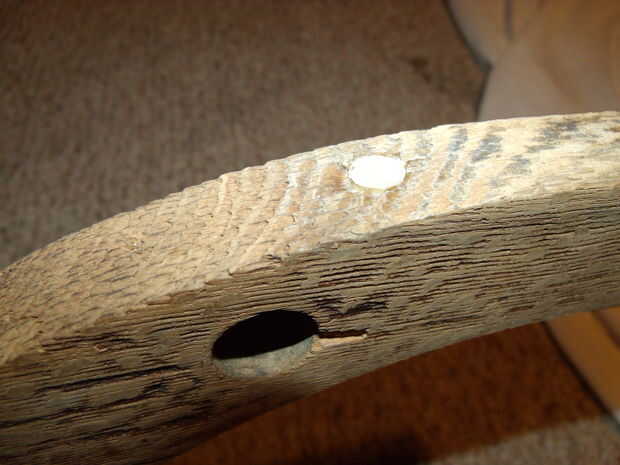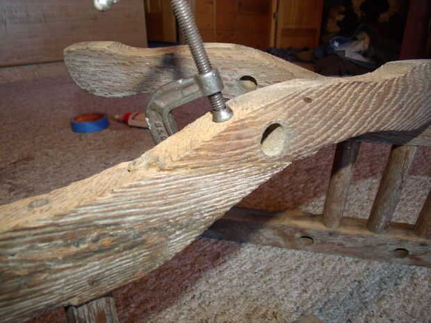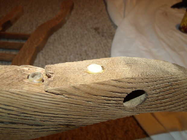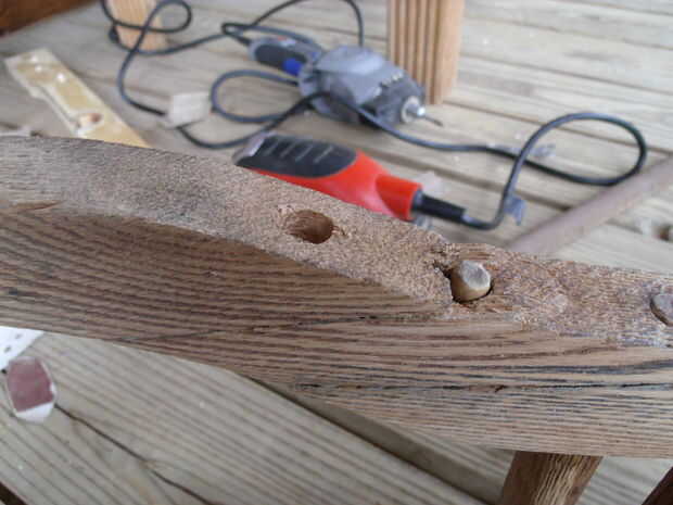 En la reparación de estructuras de apoyo, un taco agregará fuerza significativa para su reparación. Perfore un orificio de tamaño adecuado (diámetro de la espiga) de dos piezas en el descanso, apriete en el pegamento y luego el pasador. Abrazadera para arriba y limpie el exceso de pegamento.