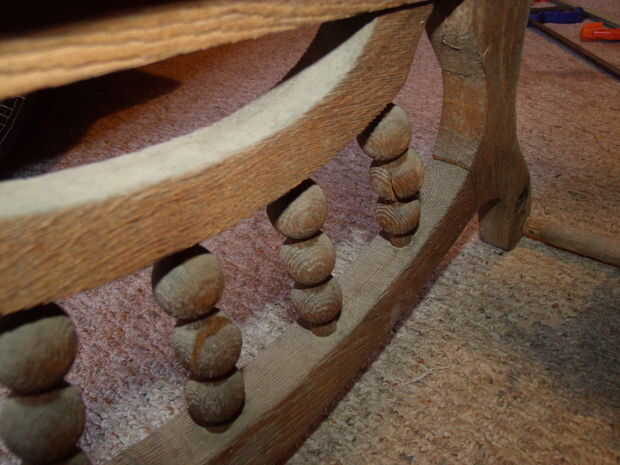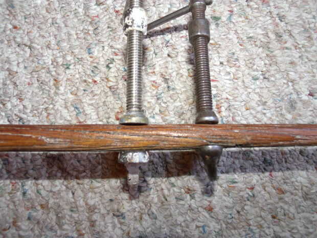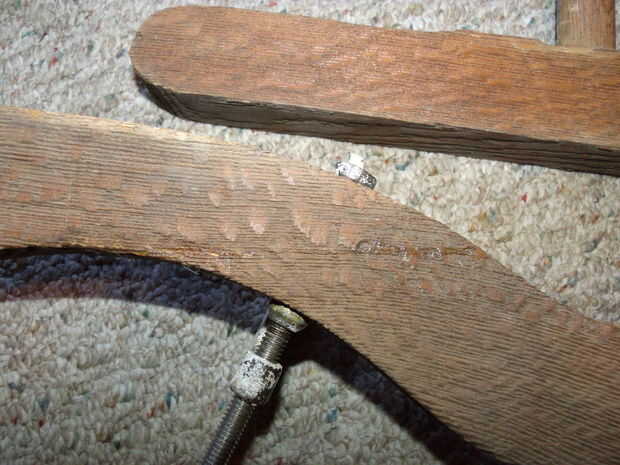 De todos modos, una vez limpiar y comprobar que encajan muy bien, comencé a unir las piezas rotas. La clave para una exitosa Unión madera es utilizar pinzas. Fije las piezas juntas y limpie cualquier exceso de pegamento. Si hay cualquier resto de goma en la superficie o en los poros, la mancha no será absorbida por la madera. Se puede lijar seco pegamento apagado o corte con un cuchillo, pero es mejor para limpiar tanto lejos como usted puede antes de que seque. Utilice un trapo muy húmedo, casi goteando. Cuando la articulación está seca, le dan una luz de lijado para eliminar cualquier residuo.