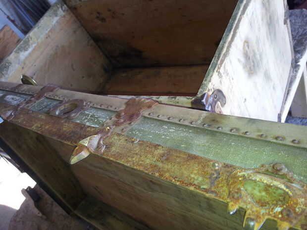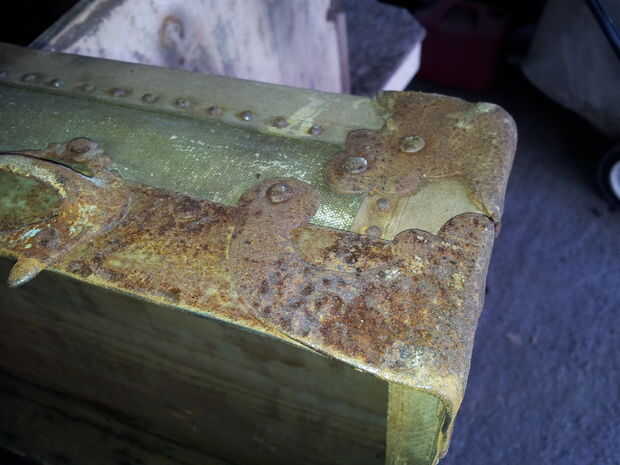 El truco es no presionar duro como que no desea pulir el metal, sólo quitar la capa externa de moho exponiendo el metal edad oscuro por debajo de. Otra cosa que aprendí fue que era mejor dejar la cubierta de lona en el tronco que estaba quitando el moho ya que protege la madera, y sería ser quitarlo de todas formas. Estaba terriblemente preocupada por el ribete de papel ya que sería ser lijar posteriormente para eliminar algunas de las manchas y la edad y también limpia algunos de los remaches que pin en su lugar.