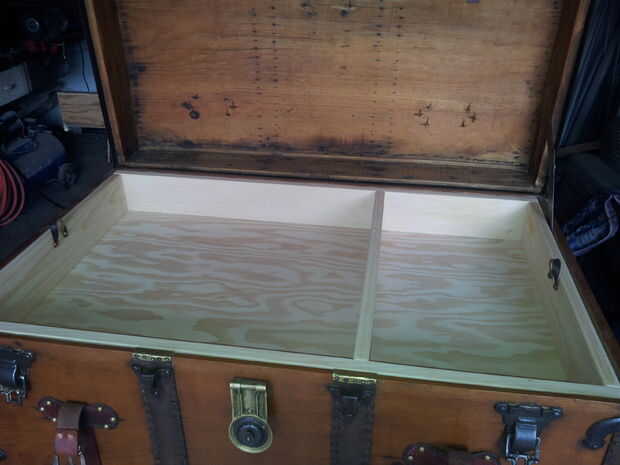 Si usted es afortunado, usted todavía tendrá la vieja bandeja que puede ser restaurada al igual que el resto del tronco. Desafortunadamente, la bandeja en mi tronco se había deteriorado totalmente y así que tuve que construir una nueva. He utilizado la bandeja vieja como plantilla y cortar un trozo de 1/8 madera contrachapada para la parte inferior, y algunos 1 x 4" pino para los lados. La imagen de abajo muestra la bandeja antes de la capa de cera de abejas, sin embargo, utilicé el mismo tres capas como utiliza en el resto del tronco para protegerlo. Por último, corté un dos 3 1/2 "x 3/4" piezas de cuero para actuar como tiradores para la bandeja luego los coloque en su lugar con tachuelas de latón de 1".