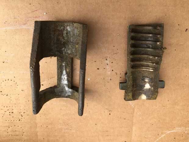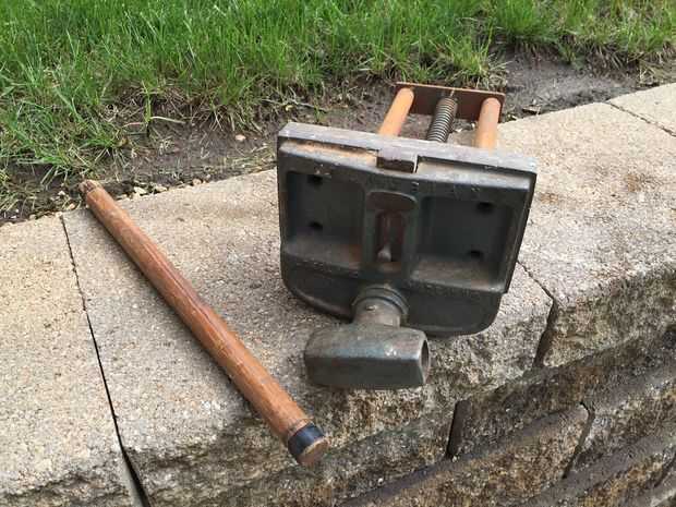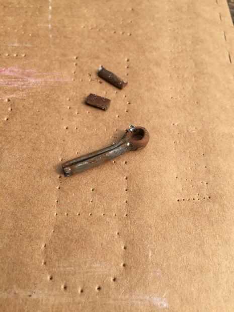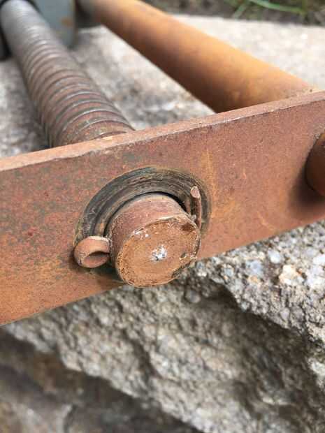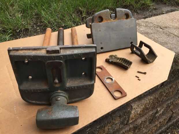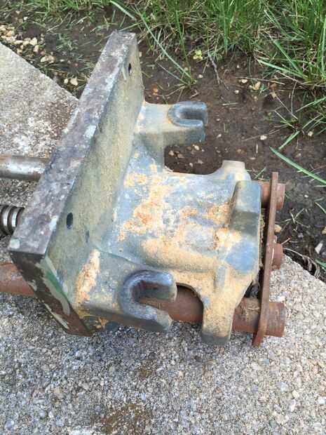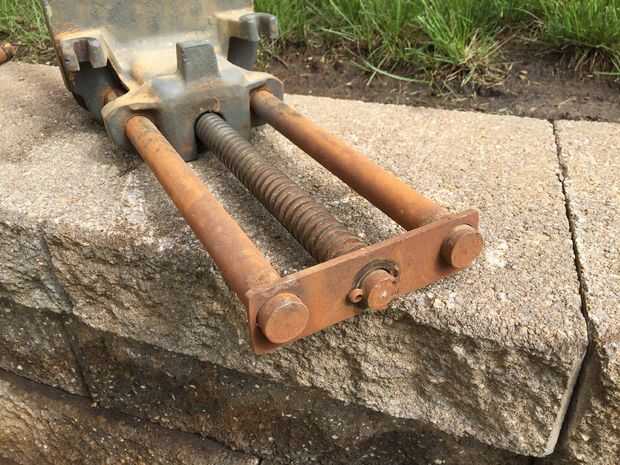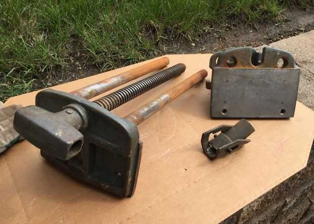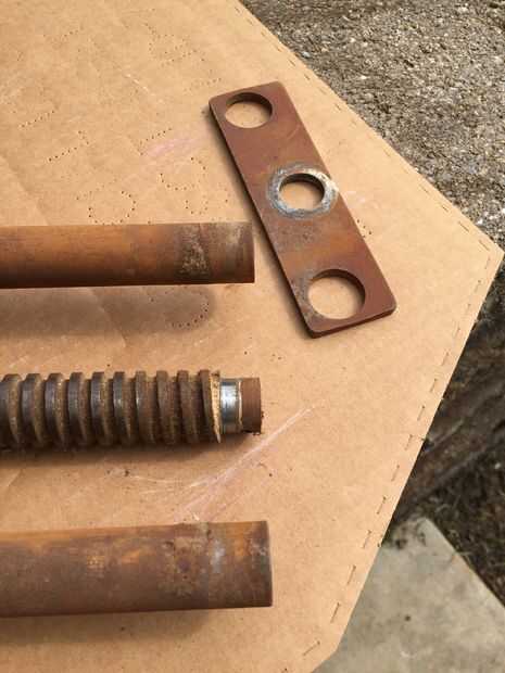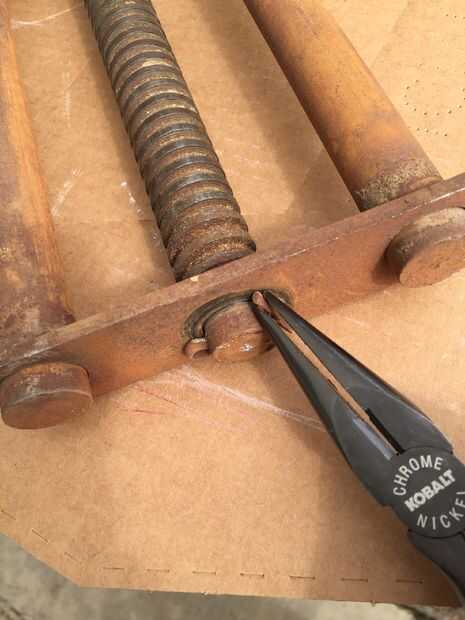 Después de deslizar hacia fuera el mango de madera del tornillo principal (se sostienen en lugar con cinta adhesiva), quité el pasador en el extremo (parte posterior) de la manija Tornillo usando alicates de punta. El pasador tiene la placa de retención/alineación de metal (placa plana 3 agujeros en ella) en su lugar. La placa mantiene las barras guía y tornillo principal en su lugar. Después de quitar la chaveta, la placa de retención las diapositivas, permitiendo mayor desmontaje. Tenga en cuenta que el pasador se rompió cuando me lo quitaron, pero son fácilmente disponibles en cualquier ferretería.