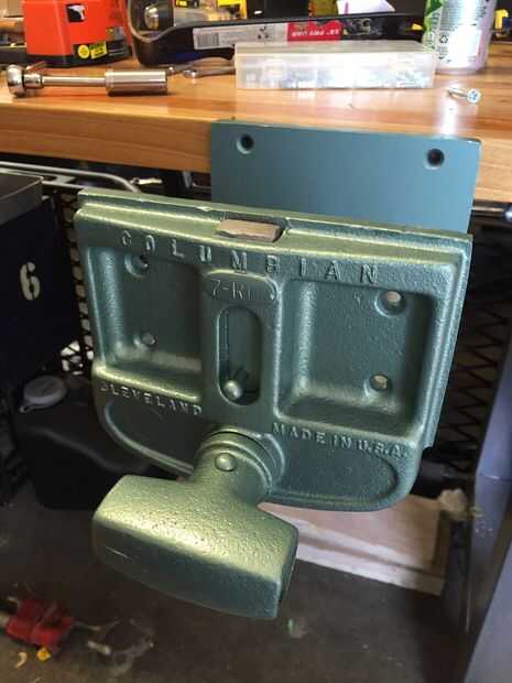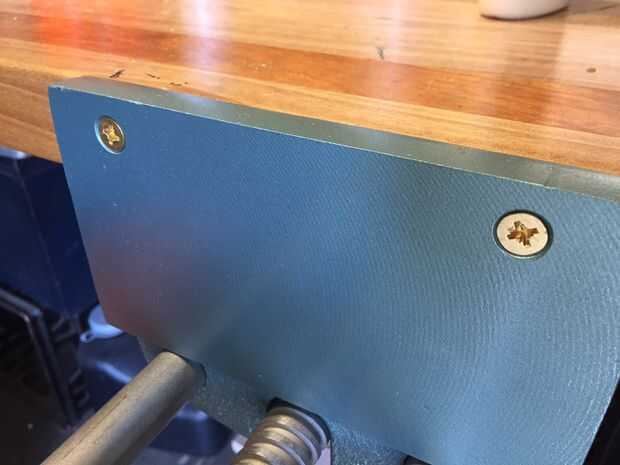 Después de taladrar los orificios para los pernos (con arandelas) manejé en su lugar, asegurar el tornillo en la parte inferior del Banco. Entonces manejé dos #12 x 2" largo los tornillos por los agujeros de montaje en la parte superior de la espalda de cara, la quijada en el borde del Banco. La mordaza se fija ahora en el Banco.
