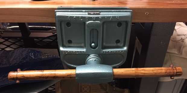 Perforados de 1/4" agujeros en los extremos de la manija de madera, había instalado en la prensa y luego pegado de 1/4" roble tacos en los agujeros para evitar deslizamiento de la mordaza.