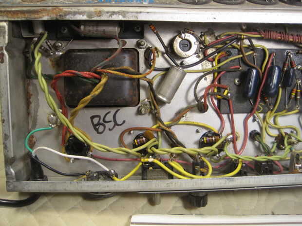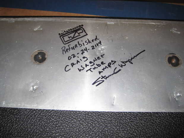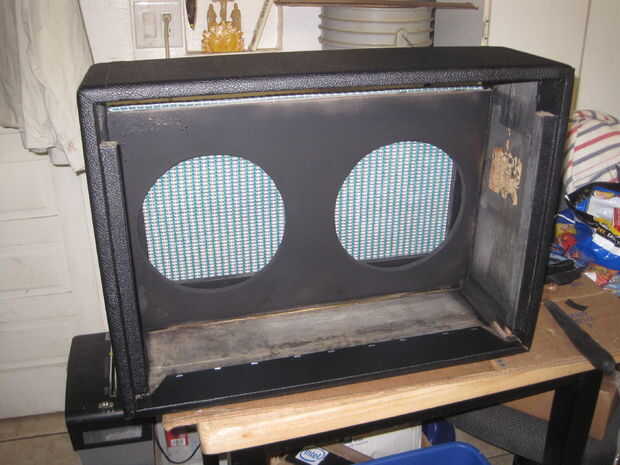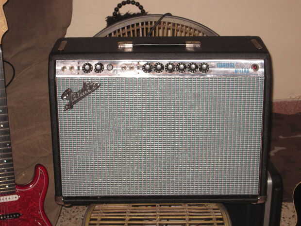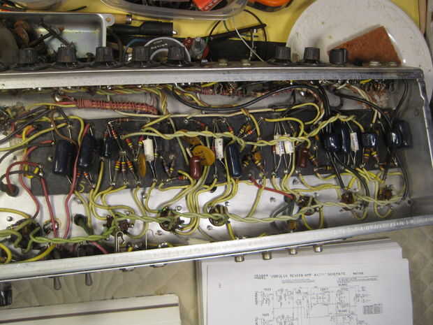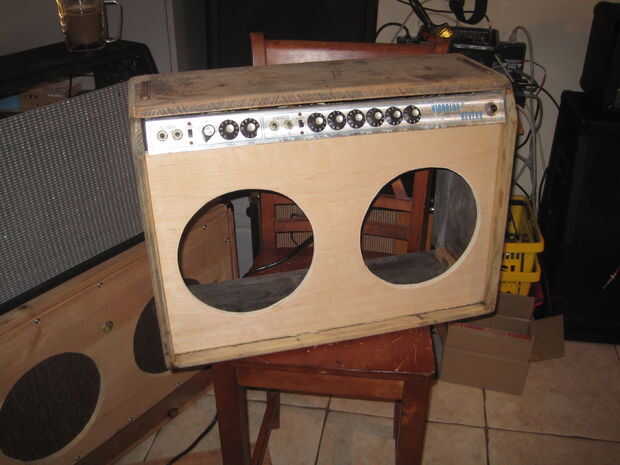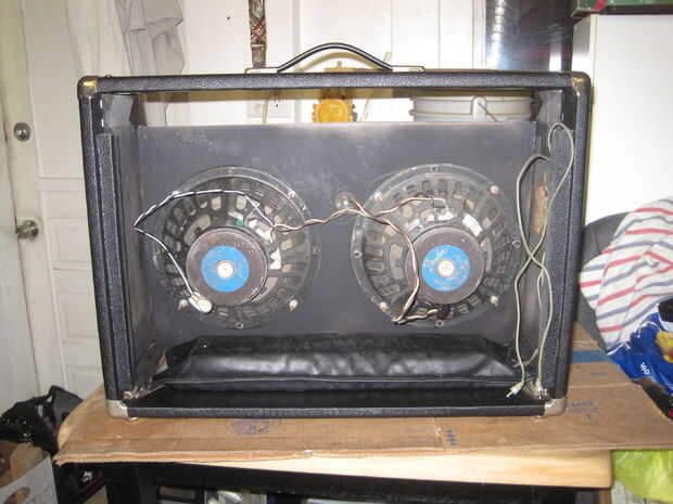 el amplificador sobrevivió un huracán en florida, fue traído a mí para la restauración. Cuando sacó del envoltorio plástico bajó aparte en pedazos. Cuando empecé a tomar la placa de bafle hacia fuera los 3 lados del gabinete interrumpió y la pieza inferior se rompió en 4 piezas. El amplificador no conservaría su valor con un nuevo gabinete así que tuve que pegar el amplificador todo nuevo junto con una nueva placa de bafle hice de birtch capas y entonces nueva fender tema tolex y parrilla, el amplificador es muy fuerte y va a durar otros 30 o 40 años. El amplificador sí mismo no estaba funcionando. Las fotos del chasis son antes de que cambié las tapas. Hice una tapa de trabajo (filtro, cátodos y biascaps). Pongo en un conjunto de Estados Unidos rca y g.e. tubos de mezcla emparejado y algunas resistencias. También cambié el resistente gama diagonal a una maceta de adorno 20 vuelta. Es un silverface tenía un pote de balance así que lo que este hizo fue hacerlo por lo que podría sesgar un inigualable conjunto de tubos y equilibrio que llamar ellos a un incluso actual, muy agradable. AMO ESTOS VIEJOS AMPLIFICADORES!