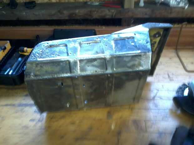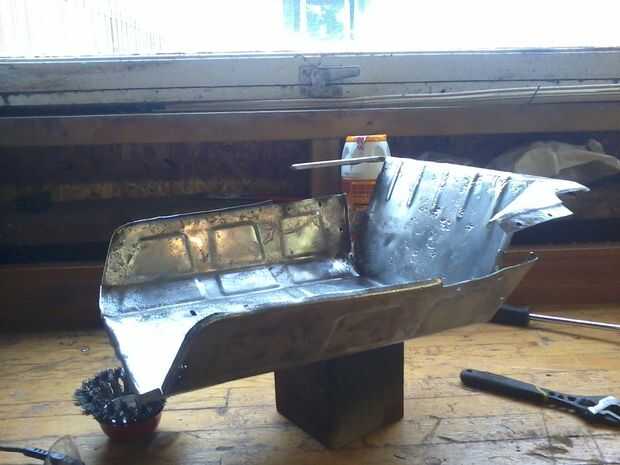 Se puede utilizar cualquier método de desmontaje de pintura que elija para este paso pero lo a moho.   Comencé con utilizado ácido muriático diluido con agua pero no recomendamos que su peligroso y puede quemarse usando < investigación si va intentar que asume NO responsabilidad si usted elige que y si dejas el metal en mucho tiempo se quema los remaches de la camioneta y que hace que el proyecto aún más difícil.   Hice un arenado gabinete fuera de un congelador antiguo que tengo y que parece ser el mejor método.   Si no tienes acceso a una chorreadora de arena entonces una amoladora y algo de paciencia es su respuesta.  Utilicé un disco de cepillo de alambre para hacer la mayor parte de la limpieza.  Bajar el moho y conseguir que el bare metal.