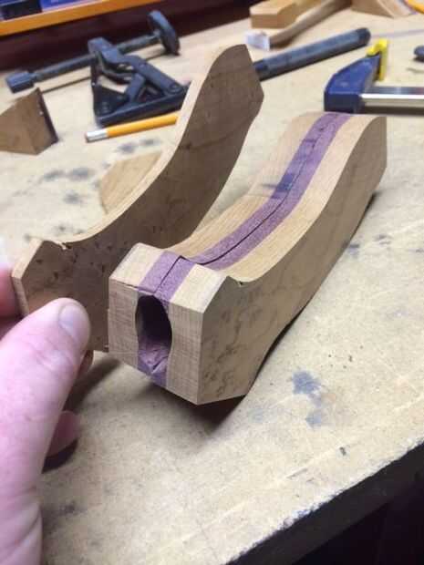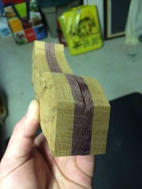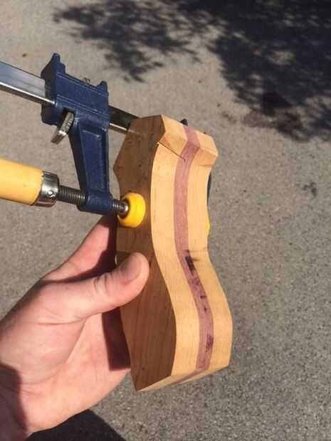 Fije las dos piezas firmemente con una sola abrazadera de C que pueden ser apretadas a mano. Trabajar de un lado a la vez y comenzar a lijar las curvas y formas en la madera para hacerlo comienzan a parecer más un mango.