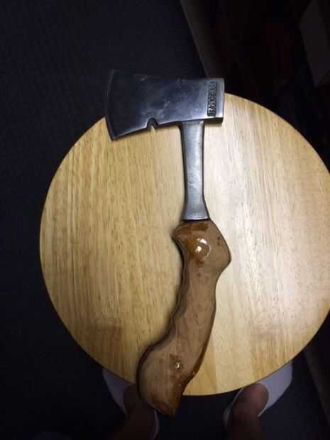 Después de taladrar el metal tang usé esos agujeros como guías y luego taladrar la madera. Entonces me aseguré que los pernos de cobre amarillo fueron cortados a un poco más grande entonces el ancho de la manija. He añadido la dimisión de epoxy a la tang, así como la madera a ambos lados y en los agujeros perforados. Básicamente había cubierto todo el interior de la manija y pernos con resina. Primero pongo el mango de madera junto a continuación martillado de las clavijas en su lugar. Añadí un poco más de resina a los pines y luego a la izquierda para fijar durante 48 horas.
