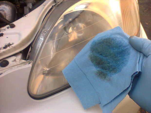 Corrí un paño de microfibra, con diluyente para laca, a través del área estaba preparando para la pintura y accidentalmente fui mirando viejo, brumoso, como faro de mierda. Para mi total sorpresa la capa opaca de la linterna del vino derecha hacia fuera y se quedó atrás fue una lente cristalina!!!