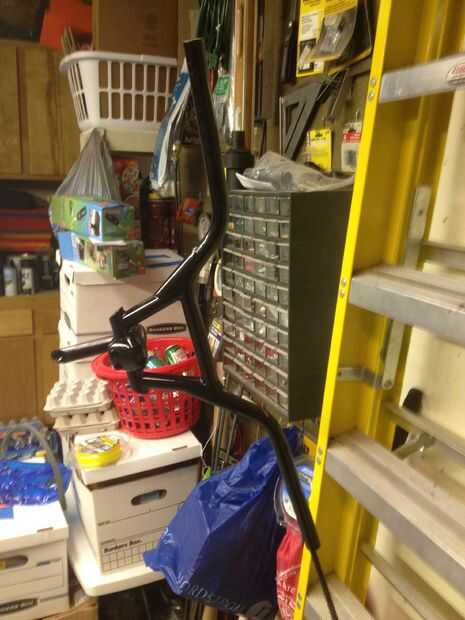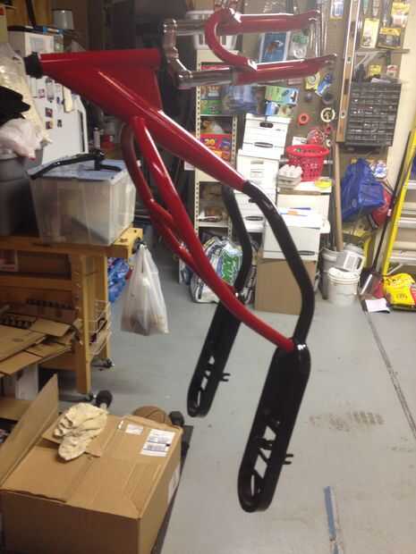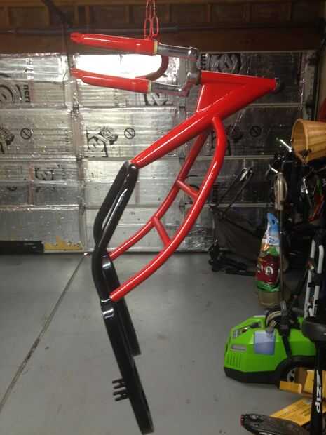 Ahora es el momento para pintar! Usamos 2 X de rust-oleum y está funcionando muy bien. Después de que la suspensión de la cinta, sugiero colgando de una cadena de una cuerda fuera o algo así (las imágenes o de la que cuelga en el garaje, no lo pintamos allí, atado a una cadena en la cinta y colgado de una cuerda). Esto hará que usted puede ver todos los lados y no pegarse de pintura a lo que establezca el marco. Había golpeado un pedazo de varilla en la tierra y resbaló en el lado del manillar. Ahora tienes una vista de 360 grados del manillar y marco. Asegúrese de que utiliza más de una capa y no la deje sentarse en el sol. Esto hará que la pintura del crujido y como el suelo del desierto. Trate de hacerlo a la sombra o cuando hace frío fuera. Después de usted que la pintura se siente durante la noche, rociar una pareja capas de capa clara sobre y dejarlo reposar de un día o dos. Después de esto, si empiezas a poner todo junto de nuevo.