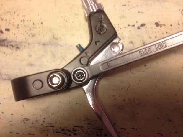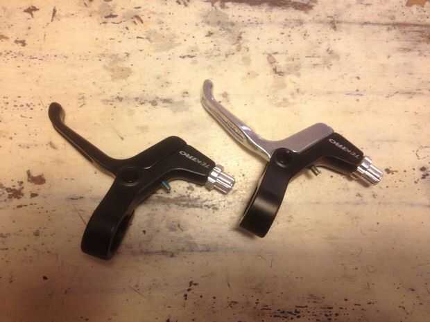 ahora tenia las palancas del freno 2, uno demasiado grande (con una palanca negra) y el tamaño adecuado (con una palanca de plata)... la palanca negra se vería mejor en la bici así que intercambian las palancas y soportes dando por resultado una palanca totalmente negra con el diámetro correcto del manillar