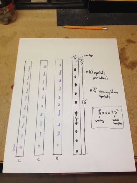 Mediante el uso de algunas matemáticas simples, pude averiguar que la circunferencia de los rodillos es 7.5" mientras que el ancho es de 5/16". Entonces dividí la circunferencia de 7.5" por 10 para obtener el espaciado entre los símbolos, que es 0,75".