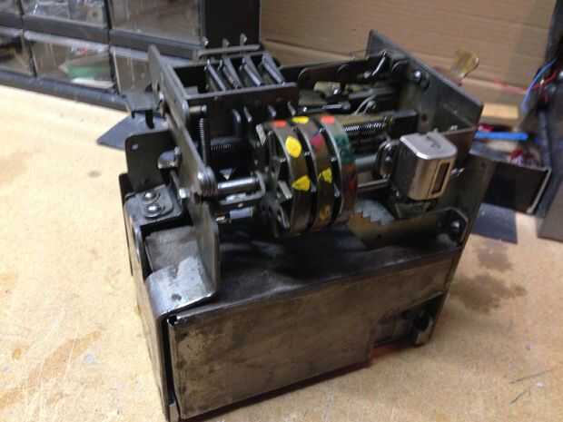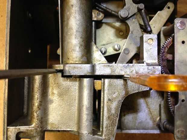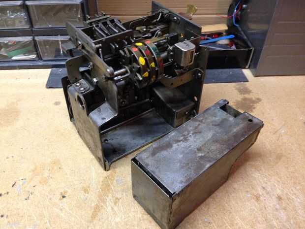 Sacando unos tornillos pequeños pudo utilizar un martillo y unos pequeños cabeza plana destornilladores para abrir la brecha entre las dos partes lo suficientemente amplia como para el níquel caer hacia fuera. Con esta mermelada despejó, el mecanismo realmente comenzó a moverse por primera vez.