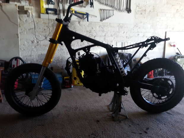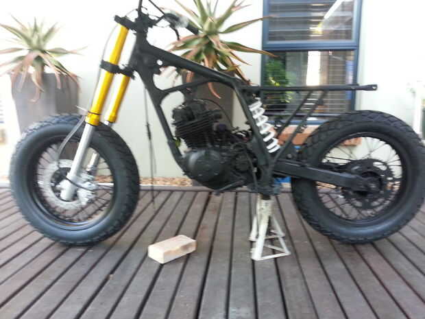 Compramos un par de golpes en nuestros locales repuestos motor chino, el yugo se hizo algunos cambios para adaptarse a los nuevos choques. Llantas nuevas dual sport fue enviado en y equilibrado en los bordes de la llanta trasera original, es el borde delantero era un borde moderno utilizado en un motard (algunos espaciadores fueron hechas para encajar la rueda entre las crisis). Como se puede ver la parte donde se coloca la en el marco de está doblado hacia abajo en la segunda foto a la moto un tipo más retro de la mirada.