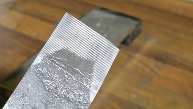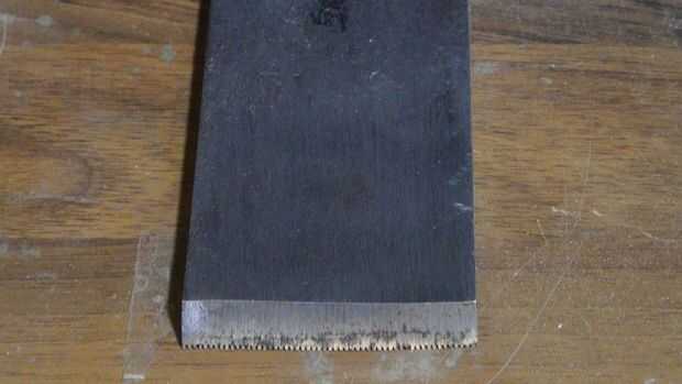 Para un filo primero necesita obtener el plano posterior pero que necesitaba para ir a un compromiso entre una hoja brillante y la eliminación también mucho de los dientes. Así no quitar todos los puntos bajos, pero fue capaz de conseguir la punta claro y esto es lo que cuenta. Tenga en cuenta que normalmente usted sólo martillo la parte de atrás en la veta de la madera para quitar las rebabas después del afilado. Gracias a DanielH207 por este señalando. De todas formas en este caso los dientes estaban ya de forma muy irregular y quería armonizarles. Tuve cuidado de no quitar demasiado material para que la plancha aún funciona bien.