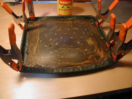 Tomar la cacerola fuera otra vez y ponga el ventilador. Pintar la superficie de asiento con una capa generosa de barcaza y presiona la espuma a él. A continuación, cepille el borde de la tapicería con la barcaza de unos 3/4" profundidad alrededor del borde. Coloque el asiento y espuma boca abajo en el patrón de la tapicería, asegurándose de que la parte delantera hacia atrás la alineación es correcta. Trabajar desde los centros hacia fuera, utilice abrazaderas para tirar a la tela alrededor de la espuma. Trabajar su camino alrededor, ajuste a medida que avanza. Cuando todos los de la tela suffuciently, resolver las arrugas, puede forzar a la tela debajo de las lengüetas de metal y doble hacia abajo para asegurarlo. Me gusta dejar las mordazas en y que la cura de todo durante la noche.
