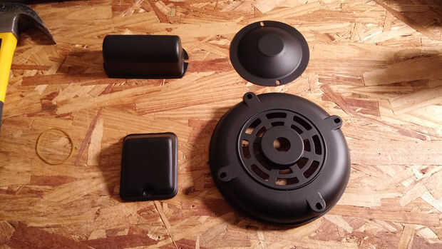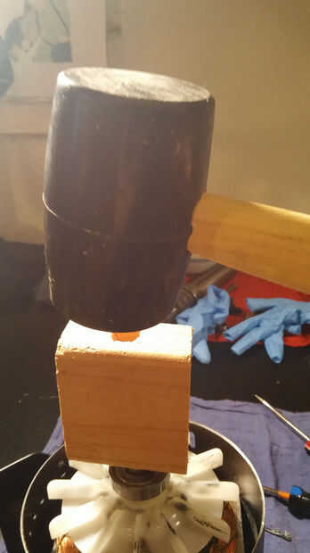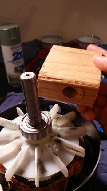 Pintar la caja del motor y volver a montar. Taladré un agujero en un pedazo de madera para aplicar presión igual al presionar el cojinete en su sitio.