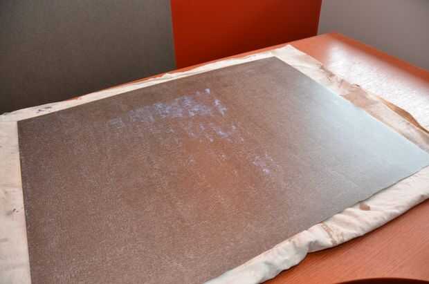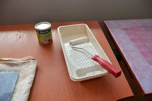 Cemento de contacto se aplica a ambas superficies a ser Unidas por separado y luego deja secar. Verifique las instrucciones de su producto, pero te dejo mis piezas en seco para una buena 40 minutos. Usé un pequeño rodillo en una bandeja desechable para la cobertura rápida y eficiente, también puede utilizar un pincel, aplicador, etc.. Utilice guantes y asegúrese de que tener buena ventilación cruzada, incluso para los productos de bajo VOC.