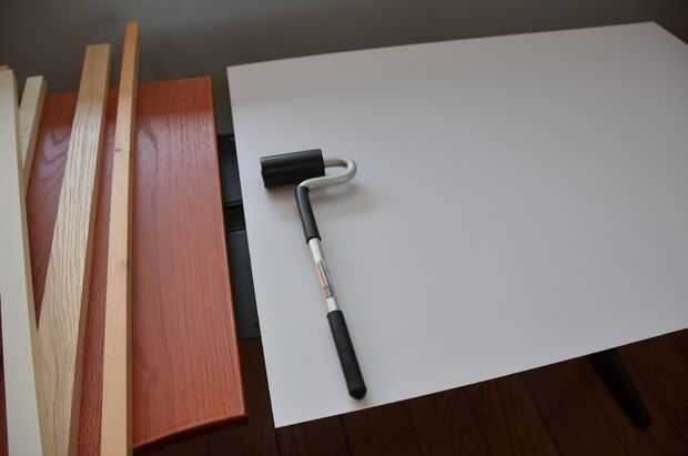 Una vez la pieza de laminado y superficie correspondiente de escritorio ambos tienen cemento aplicado y se han secado, listo unir las dos piezas. Tenga mucho cuidado al configurar esto, debido a que sólo obtiene un tiro--una vez que las dos piezas entren en contacto, hay un vínculo instantáneo. Afortunadamente el laminado es lo suficientemente rígido para que las arrugas no es realmente un problema, por lo que es una cuestión de guarnición todo derecho y luego cayendo sistemáticamente el laminado en el escritorio.