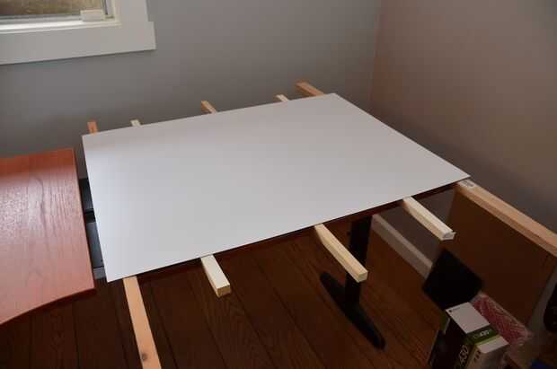Ojala una vez que tengas todos los tacos hacia fuera, la mesa será totalmente cubierta con laminado que sobresale de una pulgada o tan cada borde.