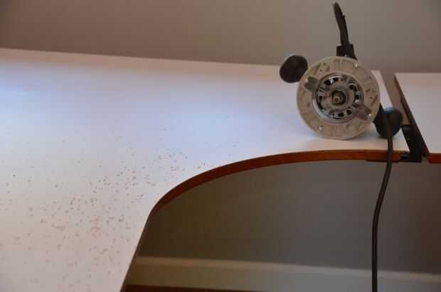 Esta es la divertida parte. Necesitarás un router de mano con una broca de corte de borde, que viene con una rueda de rodamiento pequeño debajo de la herramienta de corte. Ajustar la altura de la broca para que el rodamiento se deslice por el borde de la mesa como el cortador recorta distancia el laminado. Esta es una de las cosas más fácil para hacer con un router de mano, pero todavía trabajar cuidadosamente y usar ojo, oído y polvo protección.