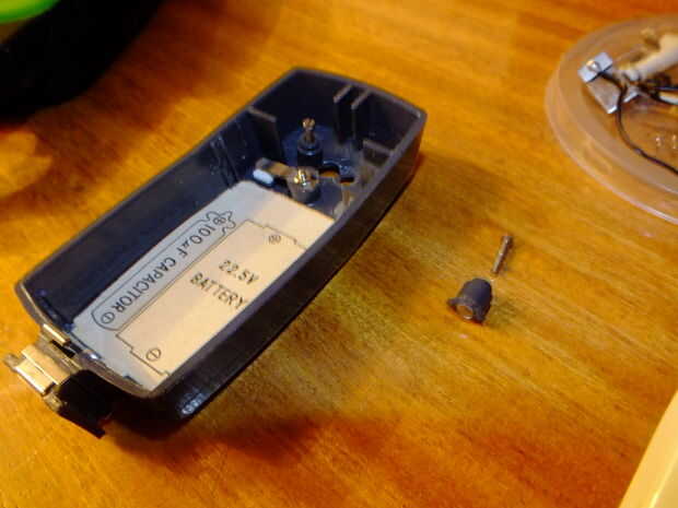 Para conectar la placa a la parte posterior, tiene dos tornillos pequeños que están detrás de la bombilla, alguien ha forzado el frente apagado, romper los dos titulares. No desear a pegamento y mantenerla como estructura original como pude, super pegado los dos titulares en el lugar, utilizando los tornillos de la tapa como una línea de guía.
