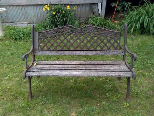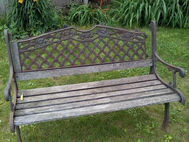 Un vecino de la nuestra tenía un viejo banco de Parque enmarcado de hierro sentado en una pila de basura en su patio trasero durante años y un día que dije que pensé que se vería bonito en mi patio. ¿Él se rió y dijo: "vean bien? está roto! Usted no puede incluso sentarse en él. " Le dije que, en todo caso, es un banco antiguo hermoso. Así que, a cambio de una cerveza, él me lo dio. La foto de arriba fue tomada después de que había montado tanto como podía con las piezas mangled que seguía siendo. El problema era ahora a terminarlo, que sea resistente y utilizable y todavía no destruir el aspecto antiguo.