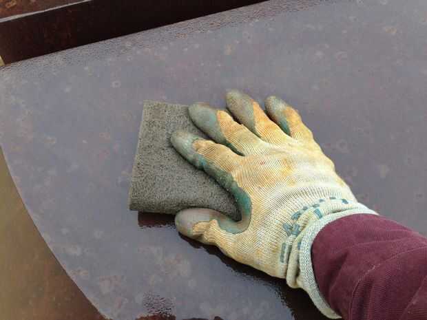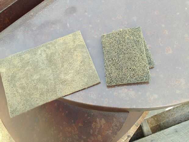 Si usted quiere conservar una pátina oxidada, rica (que), usted necesitará tener cuidado de no para fregar hasta el metal desnudo. Así que, empieza con una muy fina (gris) scotch brite de mano para ver si es lo suficientemente agresivo. Resulta que la multa pad no hizo el truco para mí así que subió a una almohadilla gruesa y mantener la limpieza.
