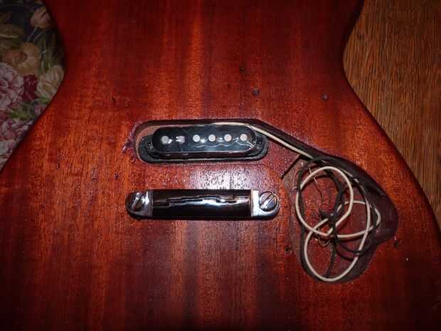 Esta guitarra tiene la electrónica, incluyendo la recolección mouted al protector de plástico de la selección. La camioneta que tenía era más pequeña que la abertura en el golpeador y no alinear los orificios de montaje. Decidí hacer un espaciador y Monte el la camioneta a la madera en lugar del cuerpo. Entonces alambré el potes, jack y recolección siguiendo las instrucciones que vienen con la pastilla. A continuación, había pulido el protector de pick con ajuste revitalizador de las madres-a-negra espalda auto y había unido con tornillos de acero inoxidable nuevo. Adjunto los sintonizadores, pero tenía a la arena los orificios en la cabeza un poco para que encajen. A continuación os adjunto las cuerdas para ver si juega.