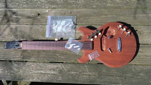 he decidido que los próximos pasos deben ser en este orden: cortar y montar el tablero del dedo, embutido los puntos perla, aplicar acabado a la guitarra, pegue allí tablero del dedo al cuello, fijar los cables de traste. Me preocupaba chapotear tintes y barnices en el tablero del dedo, así que por qué terminé el cuerpo y el cuello a continuación antes de colocar el tablero del dedo.