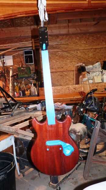 Una vez seca la mancha he colgado el cuerpo de la guitarra por los agujeros en la cabeza y aplica varias capas de poliuretano.