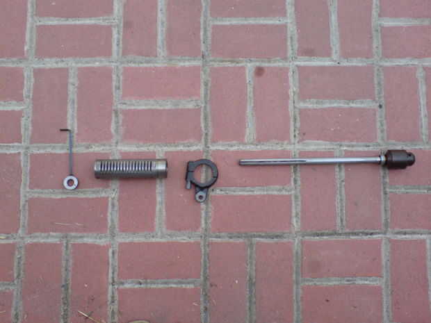 Comience con el eje y deslice el anillo de seguridad más bajo hasta el mandril. Asegúrese de que se levanta el anillo inferior de la parada de la manera correcta. Hay un agujero para la guía de tope superior en un lado que tiene que alinearse con la parte correspondiente en el casting.