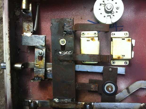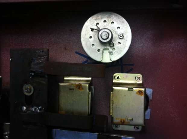 En la puerta es el mecanismo de bloqueo. Antes de mover o tomar partes de usted necesita tomar muchas fotos para que sepas cómo poner detrás junto. Comienzan a desmantelar sacando todos los tornillos y pernos y no fuerce los componentes para despegarse. Asegúrese de ordenar piezas en contenedores y tenga cuidado de no romper o dañar los tornillos y otras piezas (cuando sea posible). Si su seguro es una combinación segura probablemente tendrá discos con arboledas en él como en la imagen. Este gancho de pins de metal, seguro en el cuerpo y es lo que bloquea. La manija mueve estos pasadores metálicos en un out. Las cerraduras y dial evitan las patillas moviéndose hacia adentro y hacia afuera. Recuerde que su seguridad puede ser diferente.